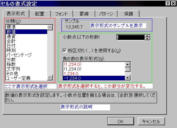 「表示形式」タブでは、「分類(C)」欄(赤枠内)で書式を選択すると、右側(緑枠内)にオプションとして指定できる内容が表示されます。表示形式の設定結果は「サンプル」欄(青枠内)で確認することができます。設定が完了したら、「OK」ボタンをクリックします。 なお、オプションとして指定できる内容は、設定する書式ごとに用意されている組み込みの表示形式から選択します。(上図は、数値を選択したときのオプションの内容です。) オプションの組み込み表示形式にない書式に変更したい場合は、「分類(C)」欄で「ユーザー定義」を選択して自分で書式を設定することもできます。 |