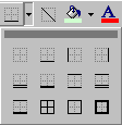 ![]() ツールバーにより罫線を設定する場合は、「罫線」アイコンの右にある▼ボタンをクリックすると、左図の罫線設定部位と、線のスタイル一覧が表示されます。 該当のボタンをクリックすると罫線が設定されます。 なお、一覧の左上端のマークは罫線消去ボタンです。 |