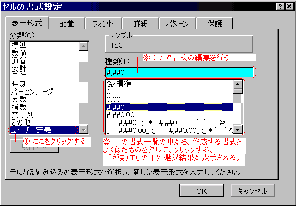 ユーザー定義の表示書式を設定するには、 1.メニューの「書式(O)」,「セル(E)」を選択します。 2.「セルの書式設定」ダイアログボックスで「表示形式」タブを選択し、「分類(C)」で「ユーザー定義」をクリックします。 3.「種類(T)」 ボックスの一覧で目的の表示形式に最も近い表示形式をクリックします。 4.「種類(T)」ボックスで、一覧から選択した表示形式を編集して新しい表示形式を作成します。 |
