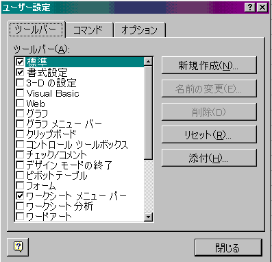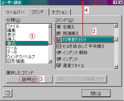 1. メニューの「ツール(T)」「ユーザー設定(C)」を選択します。 2. 「ユーザー設定」ダイアログボックスの「コマンド」タブをクリックします。 3. 分類(G)」でツールバーの種類を選択すると、右の「コマンド(D)」に該当のコマンドボタンが表示されます。 4. 各ボタンの機能はタブの左下にある「説明(P)」ボタンによって確認できます。(図番号 3 ) 5. ツールバーに追加したいボタンをクリックしたままツールバー領域の配置する位置までドラッグしてマウスボタンを離します。(図番号 4 ) 6. 「閉じる」ボタンをクリックします。 |