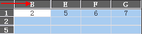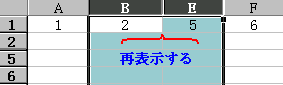 左図は、非表示列を再表示するときの列番号の選択方法です。C列、D列が非表示列となっているので、両隣のB列からE列までの列番号をドラッグして選択します。 →図は、非表示行を再表示するときの行番号の選択方法です。3 行目と4 行目が非表示行となっているので、両隣の2 行目から 5 行目列までの行番号をドラッグして選択します。 |