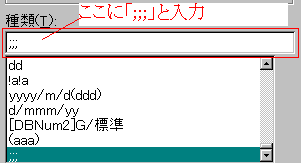 左図は、「表示形式」タブでユーザー定義を選択したときに表示されるオプション画面です。 セルに文字を表示しないようにするには、「種類(T)」の下の編集ボックスに「; (セミコロン)」を 3 つ続けて入力します。 |