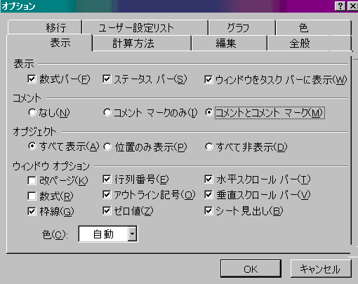 コメントとコメントマーク(M) | セルにコメントが付けられている場合、セルの右上に赤い小さな三角として表示されるコメントマーク及びコメントを表示します。 |