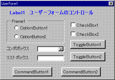 ユーザーフォーム | ユーザーフォーム(UserForm)とは、ユーザーが自由に作成できるウインドウやダイアログボックスの総称です。 前項で説明した、「ファイルを開く」「ソフトを終了する」などのダイアログボックスは、Windows(Excel)によって予め用意されているダイアログボックスですが、ユーザーフォームはユーザー自身のオリジナルダイアログボックスを作成するための専用ツールです。 ただし、ユーザーフォームそれ自体は何の機能もありませんので、次項で説明する「コントロール」を貼り付けて目的に合った機能を持たせる必要があります。(下図はユーザーフォーム) ![]() |