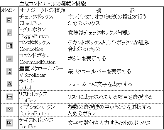 コントロール(Control)とは、ユーザーフォームに貼り付ける様々な機能を持った部品のことをいいます。主なコントロールの機能は下図のとおりです。![]() |