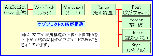 オブジェクト(Object)とは、「VBAの操作の対象となるもの」の総称をいいます。 Excelを構成する要素には、まず、「Excel」というアプリケーションが頂点にあり、データの記録媒体としてワークブック(WorkBook)が用意されています。 さらに、ブックは複数のワークシート(Worksheet)から構成されており、それぞれのシートは複数のセル(Cell・・・Cellの一定範囲をレンジ(Range)といいます。)によって区切られています。 また、Excelはグラフや図形(Chart)も作成することができ、これらの構造もブックと同じように階層的になっています。このように、Excelは階層構造で成り立っており、それぞれの階層がVBAの操作対象となるので、VBAではこれらをすべて「オブジェクト」として取り扱います。 下図は、Excelというアプリケーションに関連するオブジェクトの中からセルに関係するオブジェクトだけの階層構造を示したものです。 ![]() |