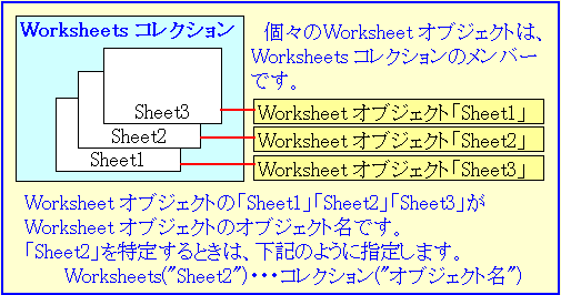 コレクション | コレクション(Collection)とは、同じ種類のオブジェクトの集合体をいいます。 Excelのフォルダには複数のブックが保存されていたり(ブックのコレクション)、ブックは何枚かのワークシートによって構成されている(ワークシートのコレクション)のが一般的です。 したがって、コレクション形態になっているオブジェクトは、オブジェクト名が複数形となっています。なお、セルは複数ありますが、セルのコレクションはRangeというオブジェクト名で表します。 また、コレクションを構成する個々のオブジェクトのことをメンバーといい、メンバーにはそれぞれ固有の名前が付けられてます。 VBAでコレクションの中から1つのオブジェクトを示す場合は、まずコレクションでオブジェクトの種類を指定し、続いてその中から操作対象の名前を明記して特定の1つのオブジェクトを示すという手順をとります。 以上のことをワークシートで説明します。 ![]() |