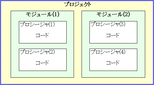 プロジェクト | プロジェクト(Project)とは、モジュール(Module・・・次項参照)の集まりのことをいいます。 具体的には、Excelのワークブック(Workbook)単位を1つのプロジェクトといい、プロジェクト名はブック名(Book)を示します。 プロジェクト、モジュール、プロシージャの関係を図示します。 ![]() |