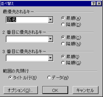 では、ファイルをオープンしたり、ソフトを終了したり、印刷の指定(ページ設定)を行ったりするときなどに、箱型をしたウインドウが表示され、その中の項目を選択したり、データの入力を行うと目的の処理を実行することができます。このウインドウのことをダイアログボックス(Dialogbox)といい、ソフトとオペレーターとの仲介役を果たすオブジェクトです。 下図は、「並べかえ」のダイアログボックス ![]() |