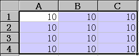 選択範囲「A1:C4」のすべての選択範囲に「10」が入力される。 |