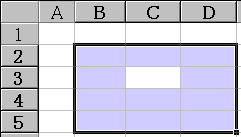 選択範囲「B2:D5」の中で、さらに選択を行うときは、当初の選択範囲の左上隅セルを基準セル「A1」として相対的な位置を選択するので、セルC3が基準セルからみたB2になる。 |