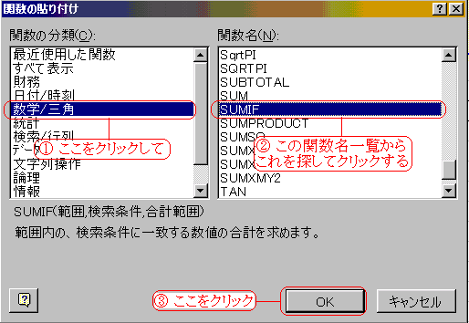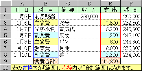 合計範囲 | $E$2:$E$8 | 実際に計算対象となるセル範囲を指定します。 合計範囲に含まれるセルの中で、検索条件を満たす「範囲」のセルと同じ行のセルだけが計算対象となります。 この図では、合計をしたいのは「支出」の金額なので支出欄のデータ範囲を指定します。 |