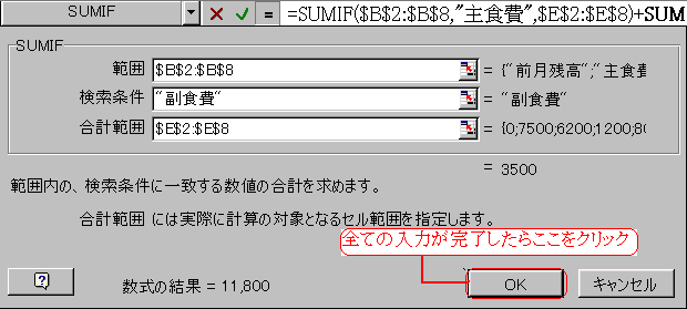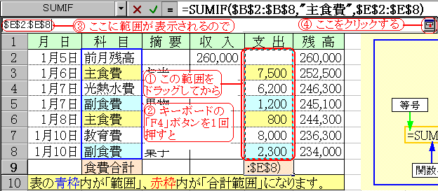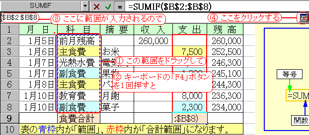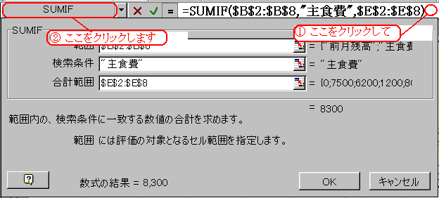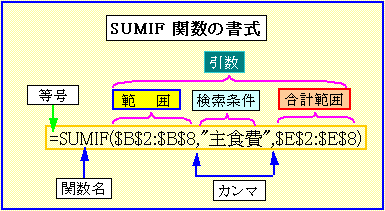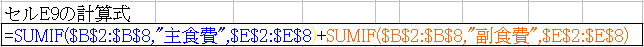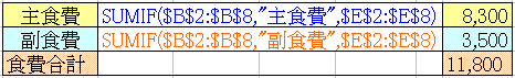 SUMIF($B$2:$B$8,"主食費",$E$2:$E$8) の計算式の意味 |