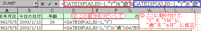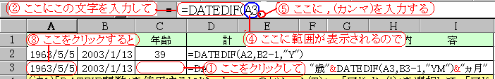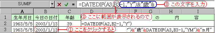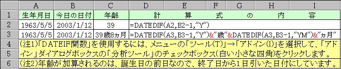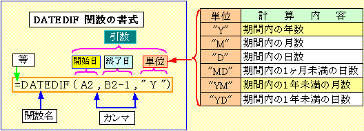 DATEDIF(A2,B2-1,"Y") の計算式の意味 |