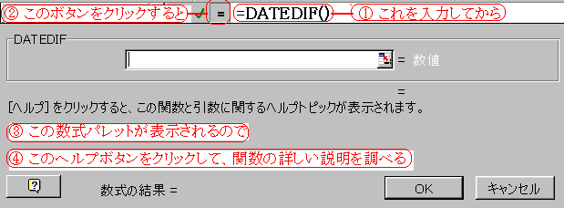 終了日 | B2-1 | 期間の終了日を指定します。 この図では、今日の日付の入力されているセル(B2)を参照しています。ただし、年齢計算は、誕生日の前日で1歳を加算しますので、引数の値から 1 をマイナスして「終了日」の日付を「今日の日付」の前日としています。 なお、今日の日付は「TODAY()」関数で求めていますので、パソコンを使用している日付となります。 |