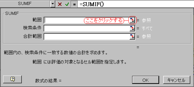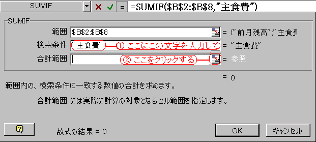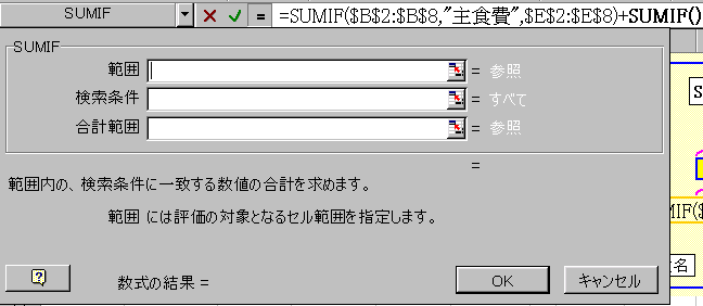 範 囲 | $B$2:$B$8 | 評価の対象となるセル範囲・・・・検索条件で指定する値が入力されているセル範囲(検索範囲)。 この図では、検索するのは、科目の「主食費」なので科目欄のデータ範囲を指定します。 |