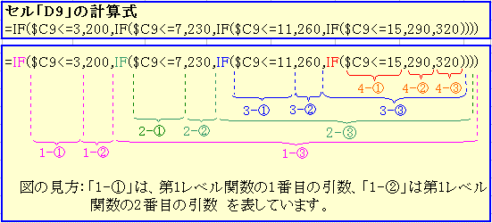 関数の位置 | 記号 | それぞれのIF関数の引数の計算式と意味(下段) |