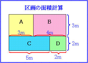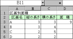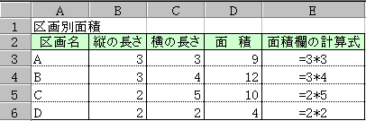 上の図では、各区画ごとの面積を求めるわけだから、入力する内容は、「区画名」「縦の長さ」「横の長さ」と、計算結果の「面積」を入れるところが必要だね。