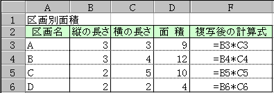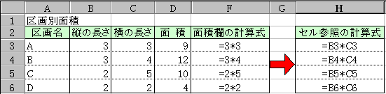 Shun:下図が複写後の計算式の内容だよ。ほんとは「面積」欄に計算式が複写されているんだけど、画面では計算結果が表示されるので、右側に複写された計算式を書いておいたんだ。それでね、式の内容を見てちょっと不思議に思わない?