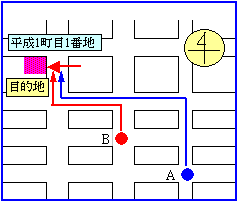 図の左上の赤い四角が shun の家(目的地)だとして、優子さんは A地点とB地点でそれぞれ二人の通行人に道順を尋ねたとするね。