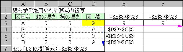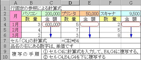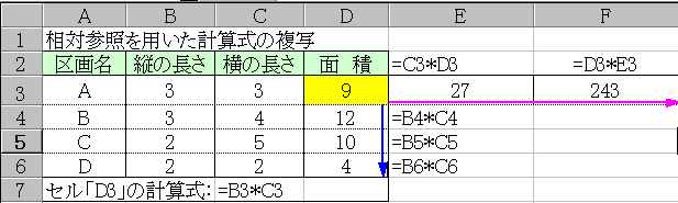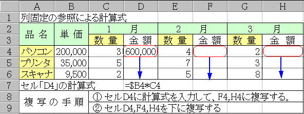 下方向に複写しても、右方向に複写してもこの関係は変わらないから、図のように右に複写すると結果が変な数字になってるんだ。分かるかな?