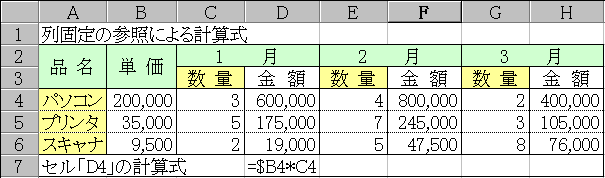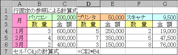 ところが数量の欄(C・E。G列)はどれも金額欄(計算式入力欄)の1つ左のセルにあるから「F4」「H4」へ複写したときにも、その位置関係を反映するために、数量欄の列への参照は相対参照とする。