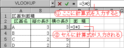 = 」をまず入力してから計算式を入力するんだ。図では、「=3*3」と入力したんだけど、入力結果はセルにも表示される。