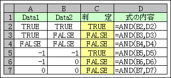 下表は、論理値の入力結果をAND関数でテストしたものである。