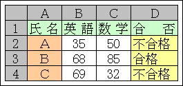 [実例1]:英語、数学の両方40点以上は「合格」、いずれかが40点未満は「不合格」とする。