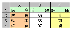 真の場合の処理を実行。(セルC2に文字列 「優」を表示する)