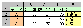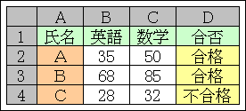 [実例1]:英語、数学の合計点が100点未満でなければ「合格」、100点未満は「不合格」とする。
