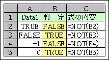 下表は、論理値の入力結果をNOT関数でテストしたものである。