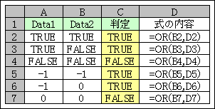 下表は、論理値の入力結果をOR関数でテストしたものである。