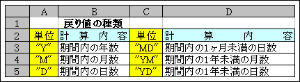 書 式 | DATEDIF(開始日,終了日,単位) |