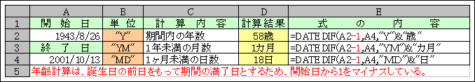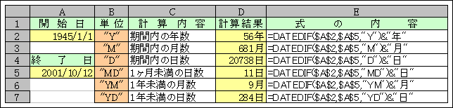 [実例1]:開始日と終了日を指定して、年数、月数、日数を求める