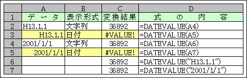 セル参照の場合に、変換元となるデータの表示形式が数値、日付となっているとエラーが発生する(C3,C5)。変換元データは「文字列」でなければならない。なお、変換結果はシリアル値で表示されているが、表示書式を日付に設定すると、日付表示となる。