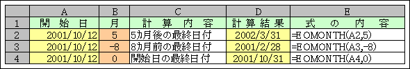 [実例2]:開始日から指定月前または後の月の最終日付を求める