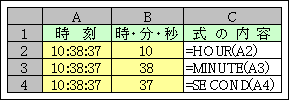 書 式 | HOUR(シリアル値) MINUTE(シリアル値) SECOND(シリアル値) |