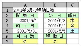 [実例1]:開始日と終了日の期間内の土・日曜、祭日を除いた稼動日数を求める