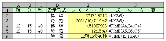 機 能 | NOW関数 現在の日付と時刻に対応するシリアル値(日付・時刻を表す数値)を算出。(現在の日付と時刻を求める。) TIME関数 指定された時刻に対応するシリアル値(時刻を表す数値)を算出。(時刻を表す数値を時刻表示形式に変換。) TIMEVALUE関数 時刻を表す文字列をシリアル値(時刻を表す数値)に変換。(時刻をシリアル値に変換。) |