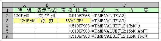 セル参照の場合に、変換元となるデータの表示形式が「数値」「時刻」となっているとエラーが発生する(C3,C5)。変換元データは「文字列」でなければならない。なお、変換結果はシリアル値で表示されているが、表示書式を時刻に設定すると、時刻表示となる。