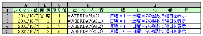 機 能 | シリアル値(日付を表す数値)を曜日に変換 |