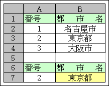 E6 の式では開始位置に2バイト、バイト数に4を指定したものである。この意味は、「名古屋市」の「名」の2分の1文字の位置から「屋」の2分の1文字までを抽出するということになり、結果として「名」「屋」それぞれが半角のスペースになってしまうため、「古」しか表示されないことになる(半角スペース+「古」+半角スペース)。