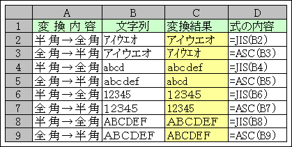 機 能 | JIS関数 文字列内の半角の英数カナ文字を、全角文字に変換。 ASC関数 文字列内の全角の英数カナ文字を、半角文字に変換。 |