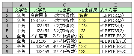 したがって、全角文字列に対するLEFTB関数のバイト数は偶数でないと正確に表示されない。