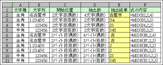 したがって、全角文字列に対するMIDB関数の開始位置は奇数、バイト数は偶数でないと正確に表示されない。
