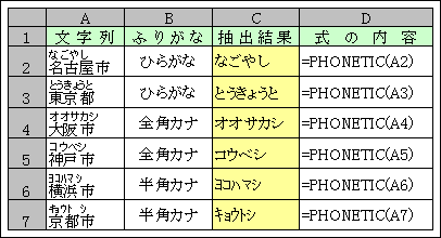 説 明 | 範囲 ふりがなの文字列を含む 1 つまたは複数のセルの参照を指定する。 範囲 に複数のセルを指定した場合は、セル範囲の左上隅に指定されているふりがなが返される。 「ふりがな」の書式設定 「ふりがな」の文字の種類には、ひらがな、全角カタカナ、半角カタカナがある。設定方法は、メニューバーの「書式」→「ふりがな」→「設定」で行う。 「ふりがな」の文字の修正は、メニューバーの「書式」→「ふりがな」→「編集」で行う。 PHONETIC関数を実行した結果得られる「ふれがな」は上記で指定した内容となる。 |