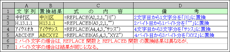 機 能 | REPLACE関数→文字列中の指定された数の文字を別の文字に置換。半角と全角の区別なく 1 文字を 1 として処理が行われる。 REPLACEB関数→文字列中の指定されたバイト数の文字を別の文字に置換。バイト数 (半角単位) で処理が行われる。 |
