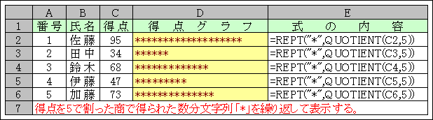QUOTIENT関数で得られた結果の数分、文字列「*」を繰り返して表示する。