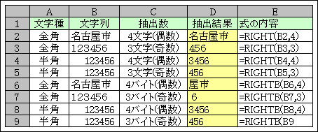 RIGHT関数は、文字列が全角・半角に関わりなく、指定した文字数を抽出する。
